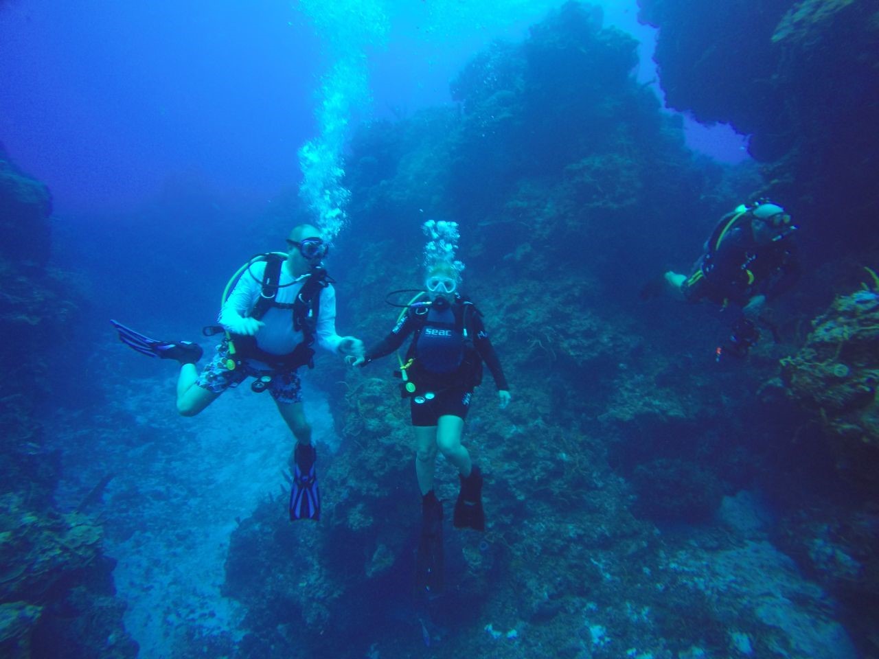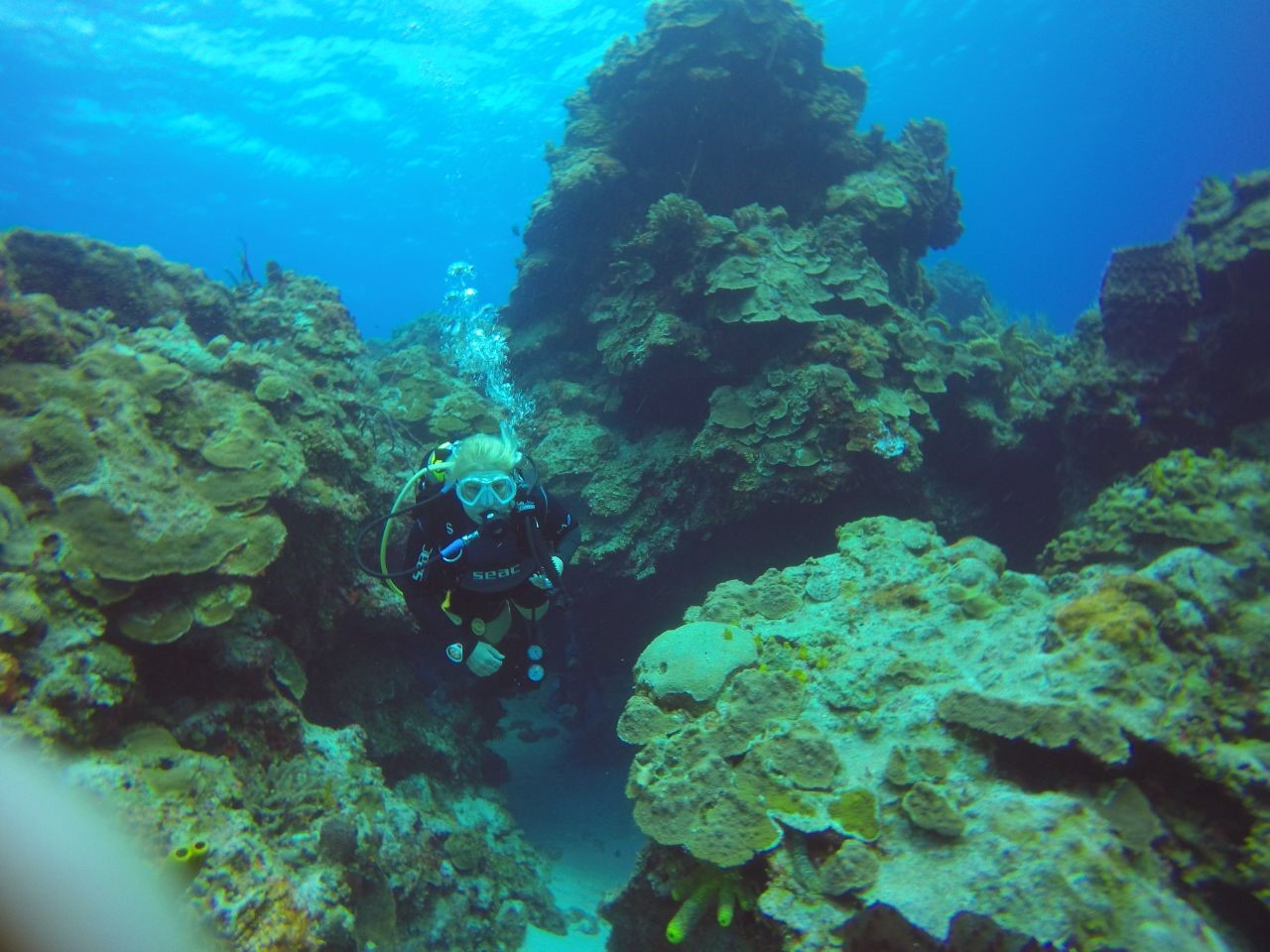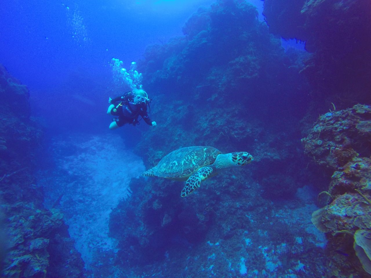 Anmerkungen: Pam ist bereit zu tauchen, sie hat tatsächlich den Tauchplatz ausgewählt, und sobald wir absteigen, wartete dieser schöne Durchgang auf uns, er öffnete sich weit und schön, die ersten Meeresschildkröten zeigen sich und es ist Zeit, ein Foto zu machen, schön !, tiefblau auf der einen Seite die riesige Korallenformation auf der anderen, auch gut für ein Foto mit Brian, langes und schönes Durchschwimmen zum Abschluss des Tauchgangs über die Sandfläche, wo sich der Stachelrochen zeigt, einfach genial!
