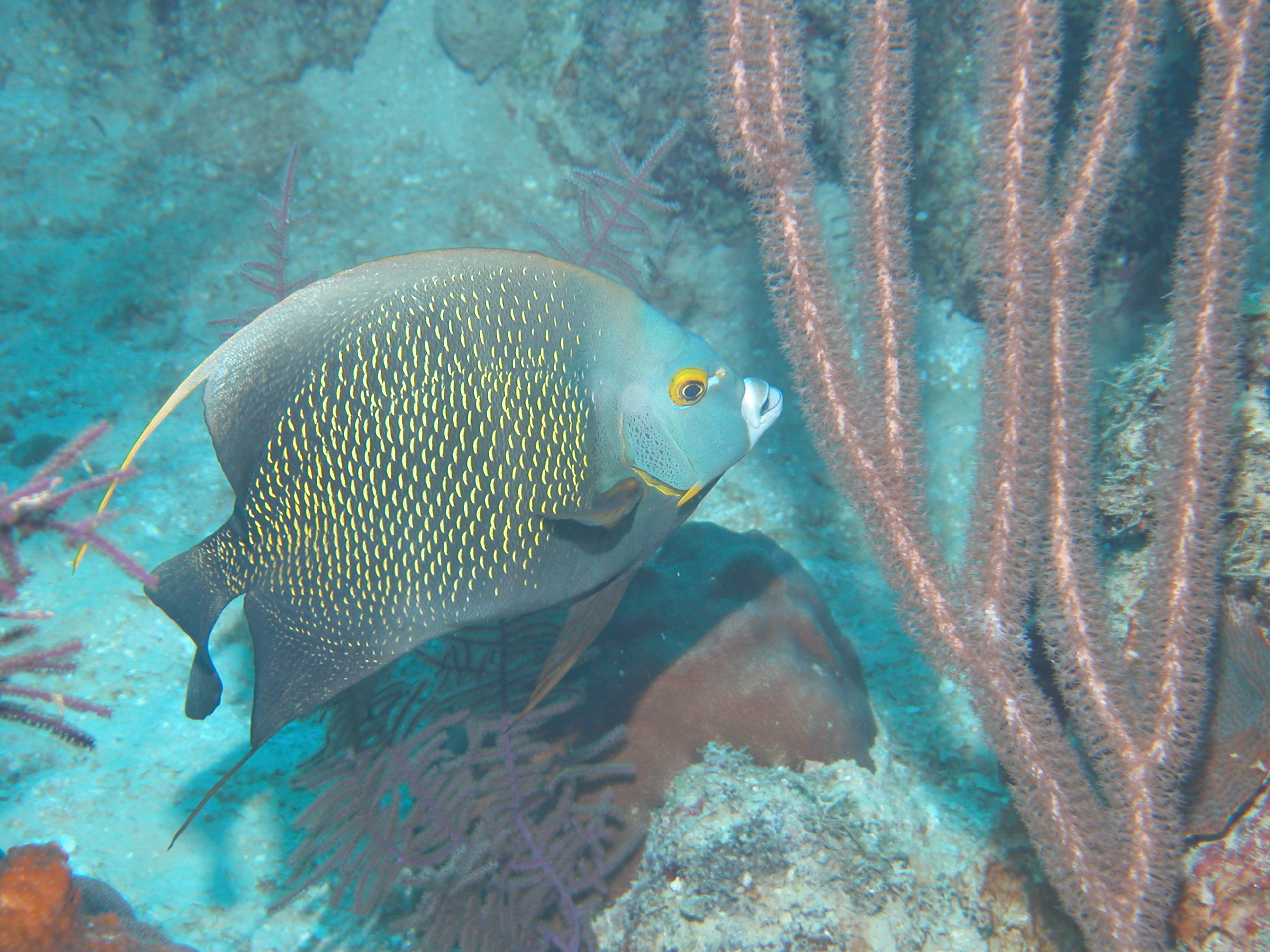 Recuerdo que hace años trabajando en Honduras había un gran arenal que frecuentábamos. El pez ángel nadaría junto a los buzos animándolos a cavar en la arena abanicándola con sus aletas pectorales. Como buzos, podríamos cavar rápidamente en el soporte para removerlo (nota: te sugiero encarecidamente que no hagas esto, te arrepentirás jajaja) y los gusanos poliquetos quedarían expuestos y el pez ángel lo atraparía instantáneamente. Si quisiéramos ser picados voluntariamente por el gusano (vea la nota anterior), podría agarrarlo nosotros mismos y sostenerlo en nuestros dedos, el pez ángel lo sacaría de la punta de nuestros dedos. Por el contrario, los juveniles son bastante tímidos y parecen temer particularmente a los buzos y específicamente a mi cámara, a menudo retirándose a la estructura del arrecife hasta que la cámara malvada se haya ido.