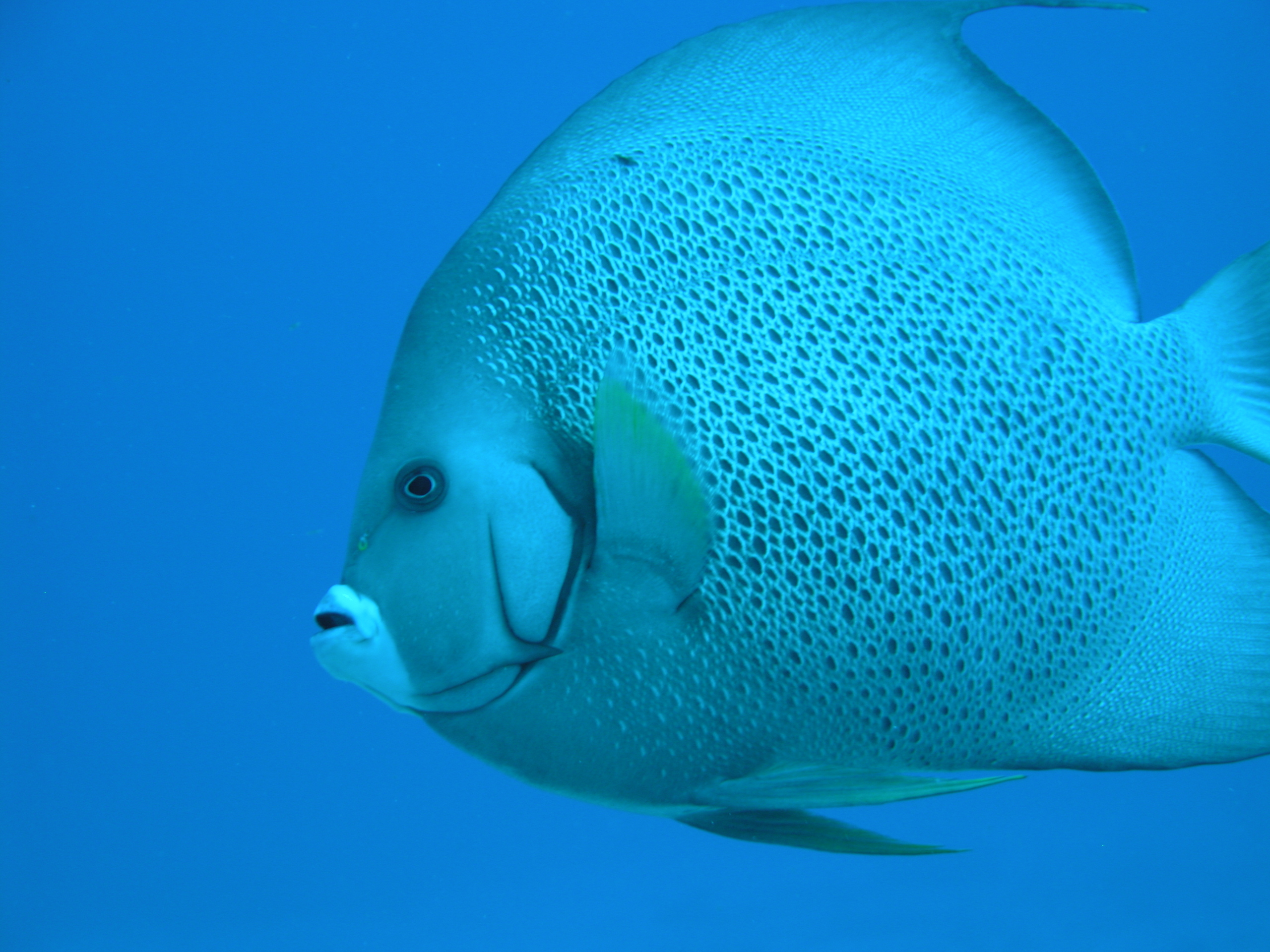 Si pasa el mouse sobre la imagen, revelará la especie. La cola del pez ángel francés es un círculo amarillo completo, mientras que la cola del pez ángel gris es un borde amarillo incompleto, a menudo con un borde claro (como se ve) o blanco.